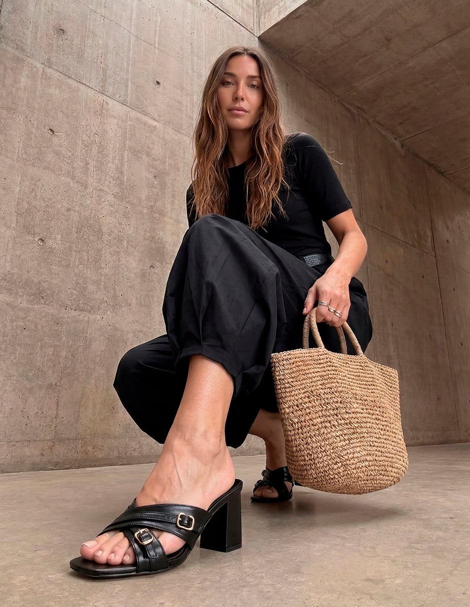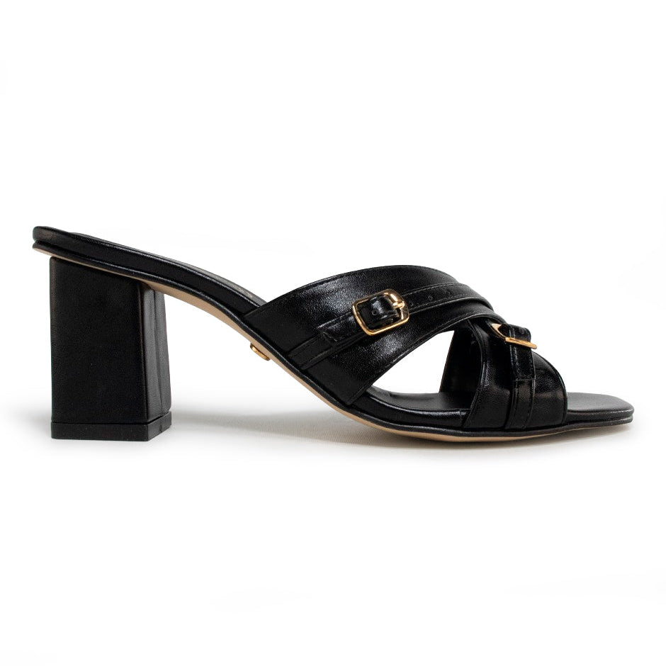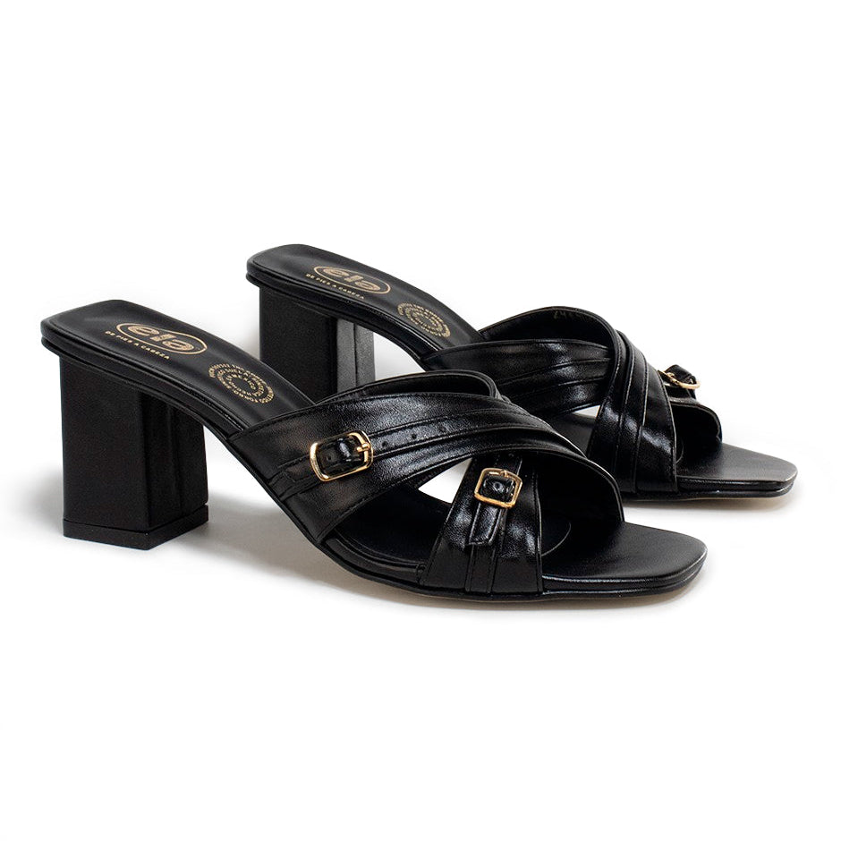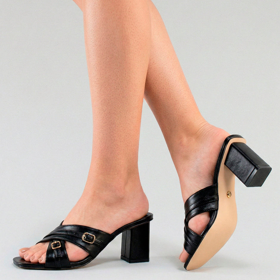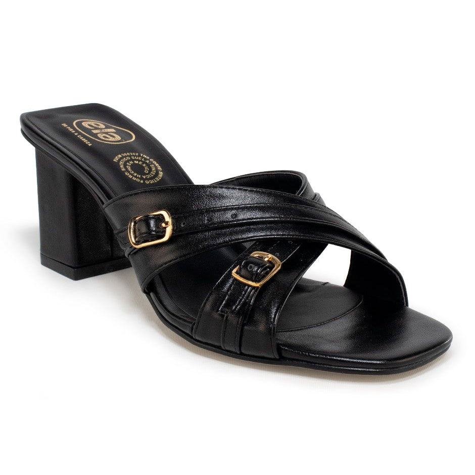 Sandalias de tacón ancho elaboradas en napa sintética de alta calidad y durabilidad, disponibles en color negro y tan, con punta cuadrada.