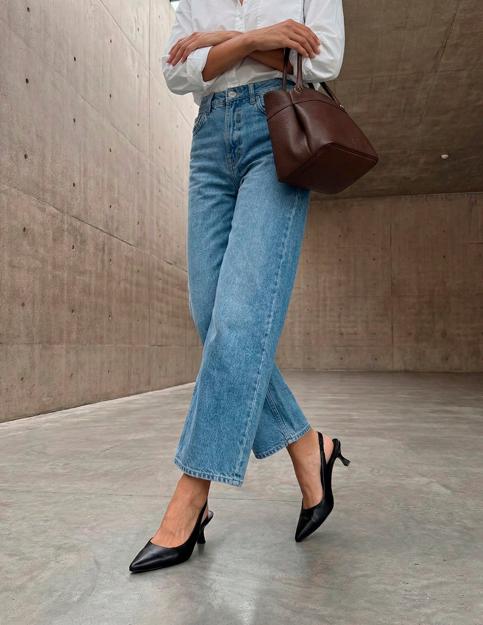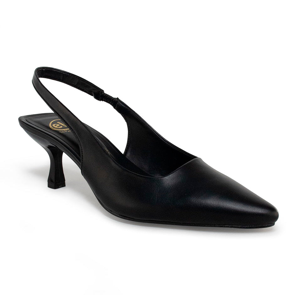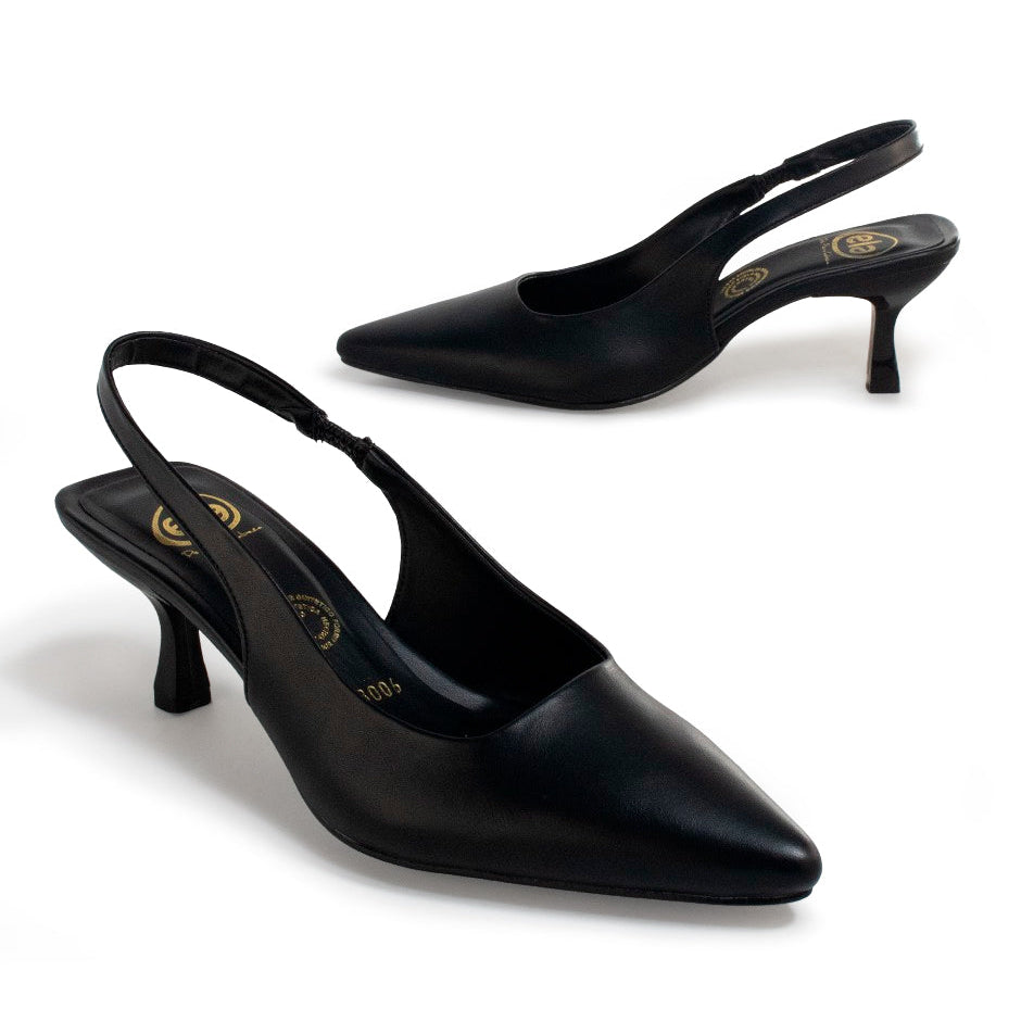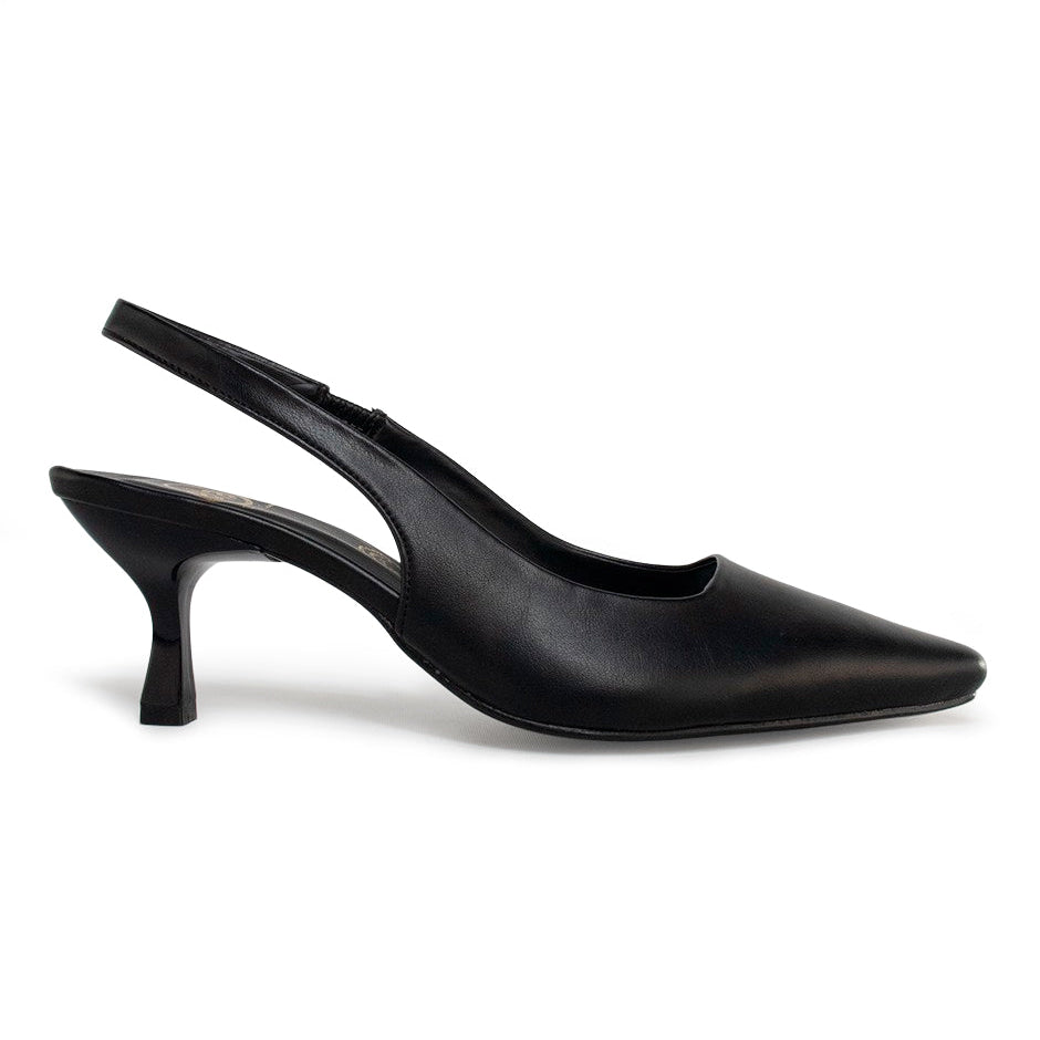 Zapatos de tacón destalonados, hechos en napa sintética de alta calidad y durabilidad. Con diseño moderno y cómodo tacón al tono. Estilo en punta, elegante y perfecto para combinar con pantalones o vestidos. Disponibles en color ecru (beige) y negro.