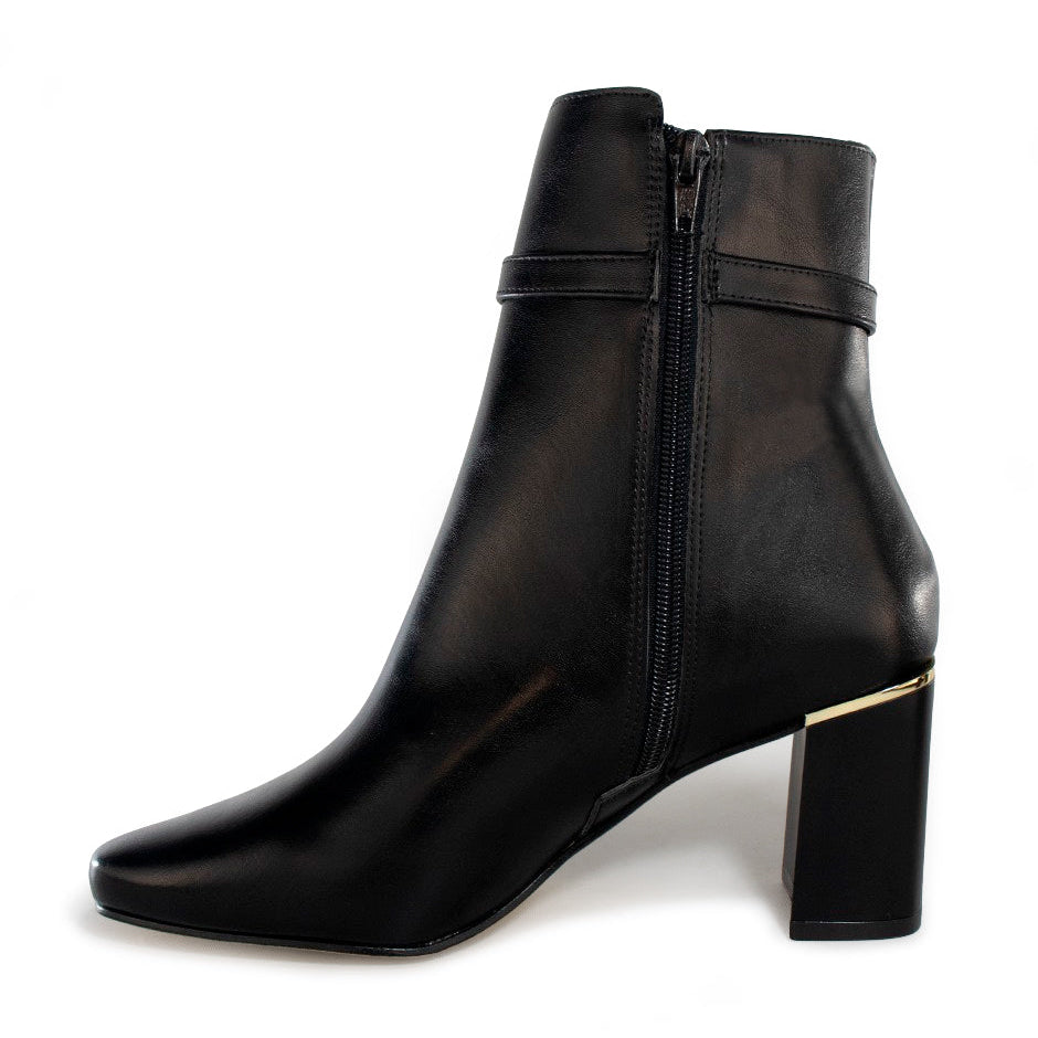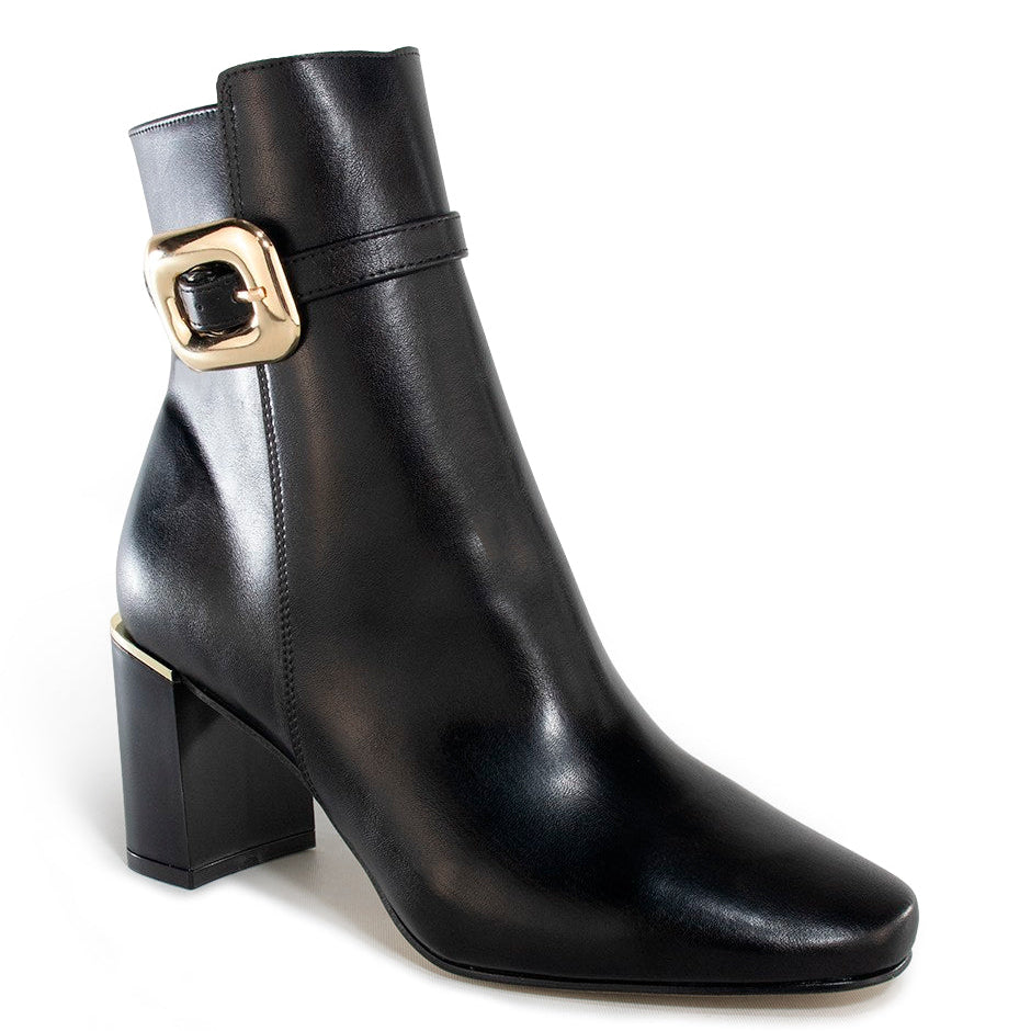 Botines con aplicación en laterales, de tira con hebilla decorativa, con tacón ancho para mujer, elaborados en material sintético de alta calidad y durabilidad. Disponibles en color negro.