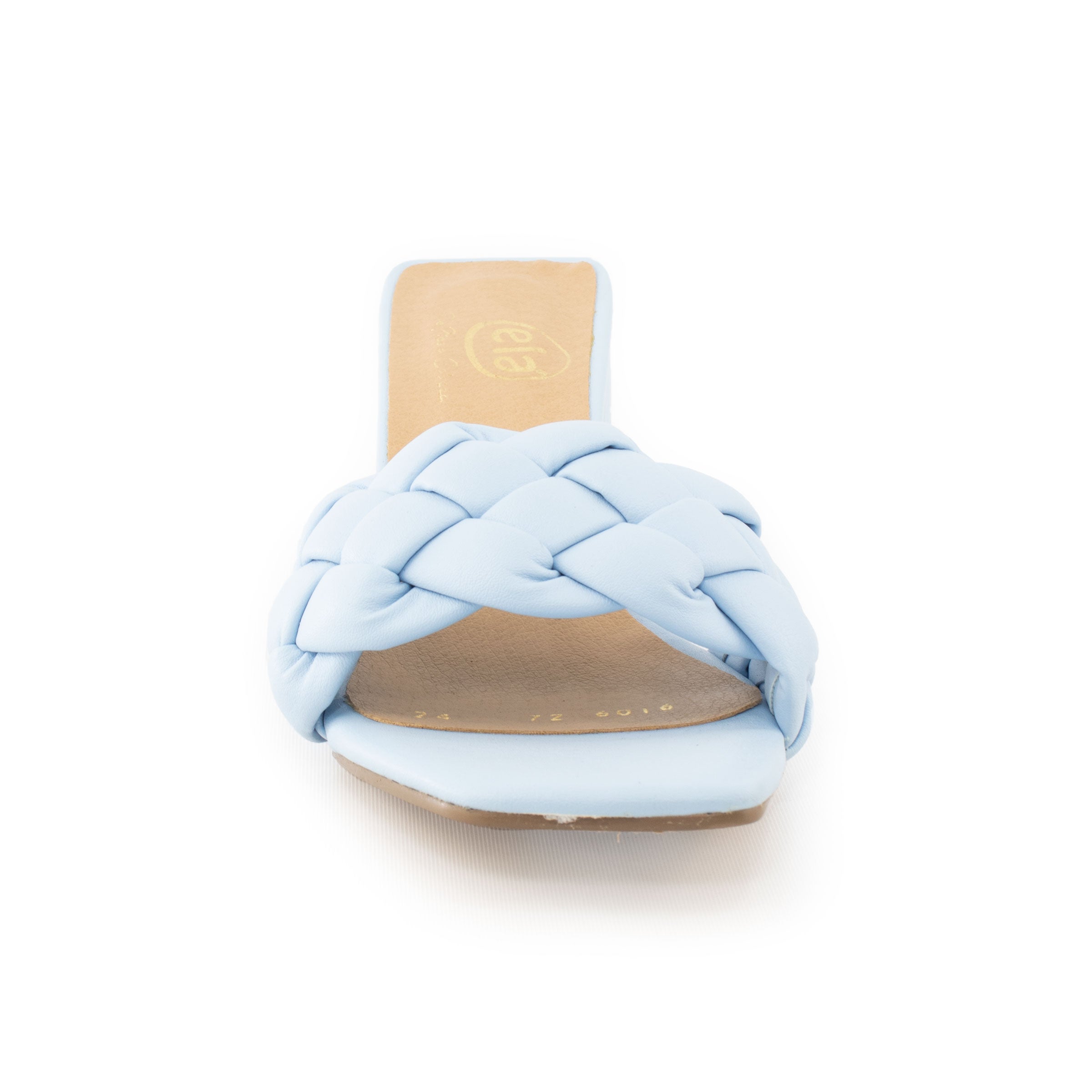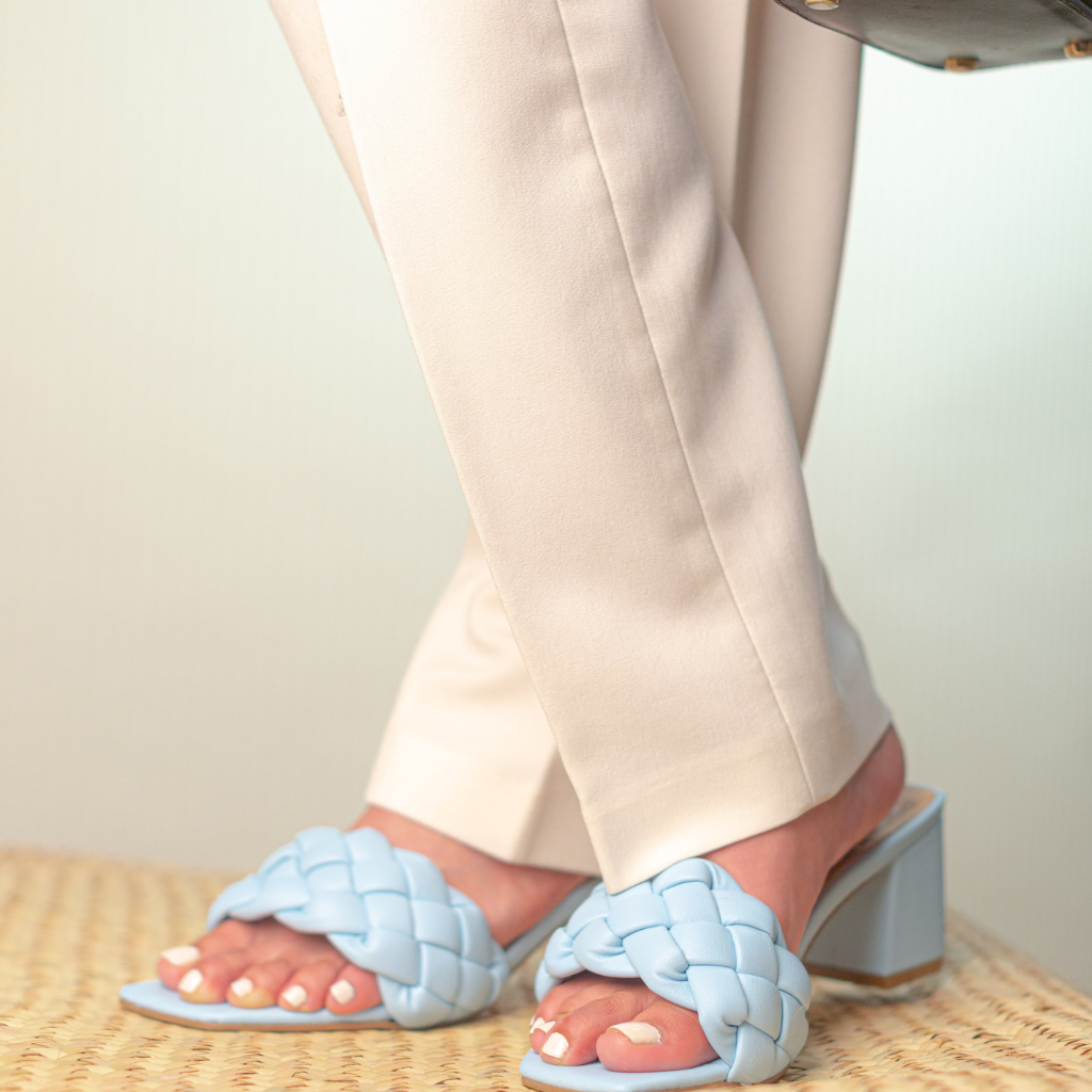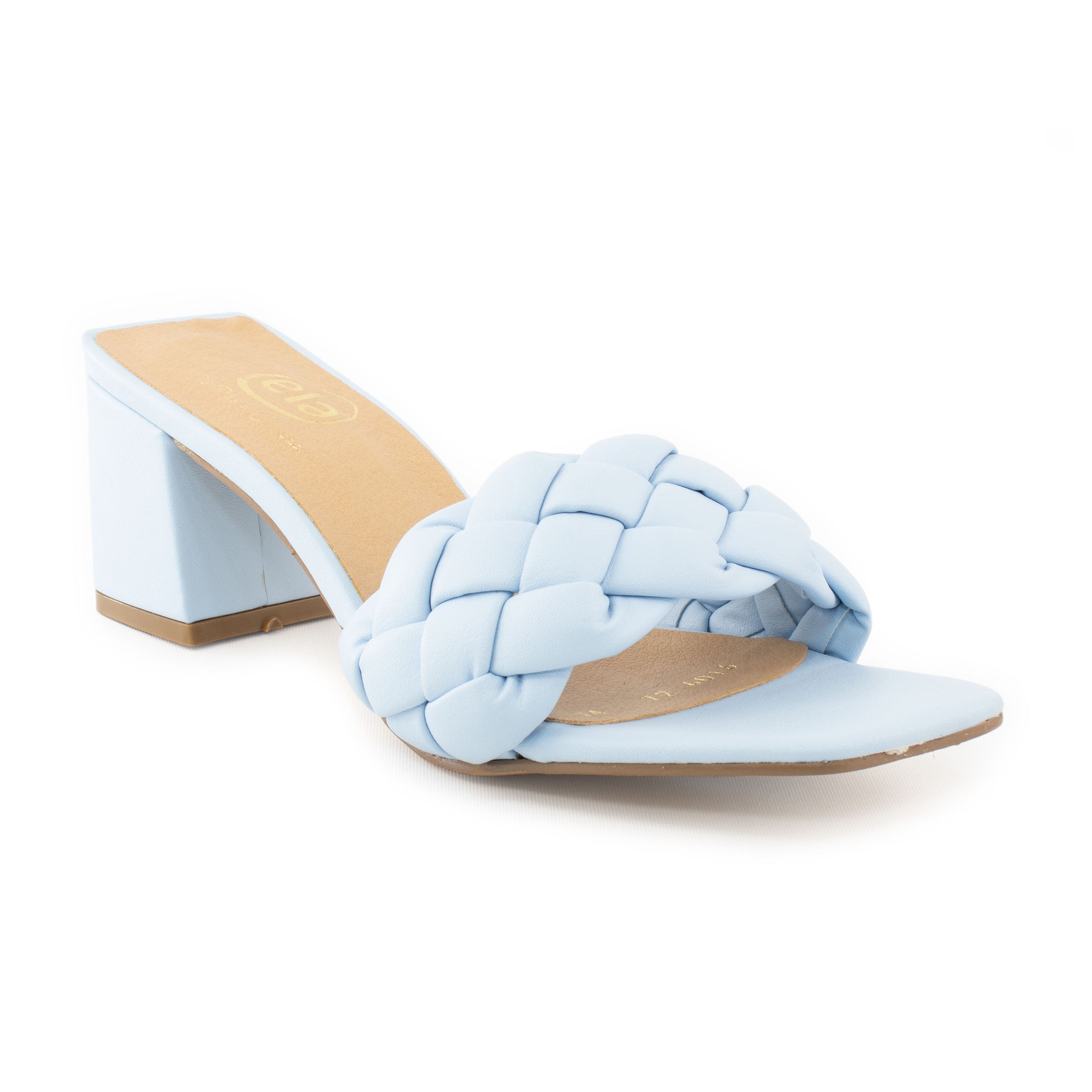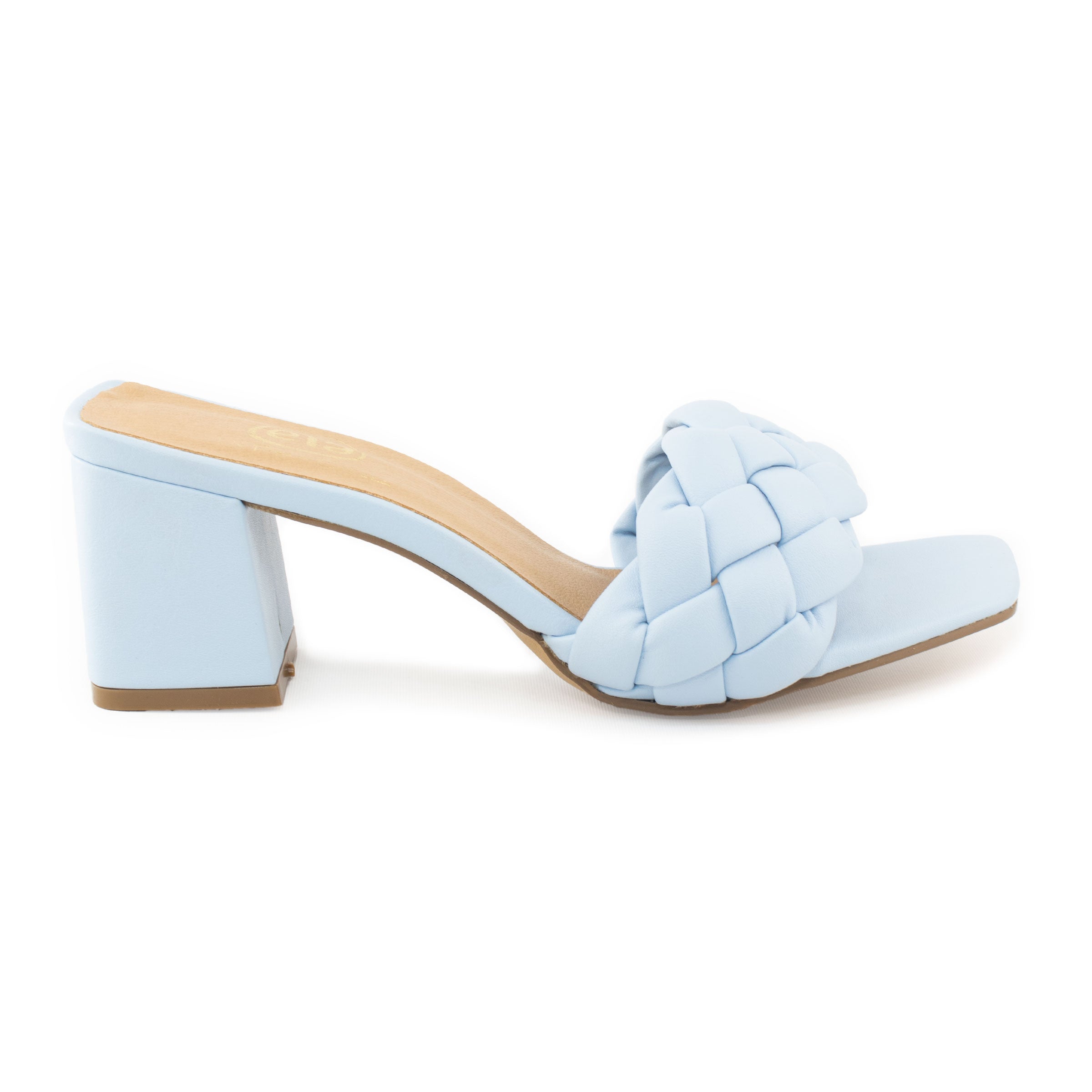 Sandalias de tacón elaboradas en napa sintética de alta calidad y durabilidad, disponibles en color azul (baby blue) y rosa pálido, con punta cuadrada.